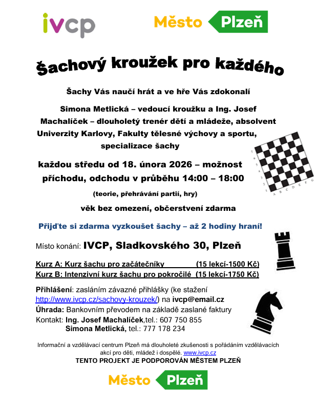 Simona Metlická – vedoucí kroužku a Ing. Josef Machalíček – dlouholetý trenér dětí a mládeže, absolvent Univerzity Karlovy, Fakulty tělesné výchovy a sportu, specializace šachy. Věk bez omezení! Každou středu od 18. února 2026 (možnost příchodu i odchodu v průběhu 14:00 - 18:00).